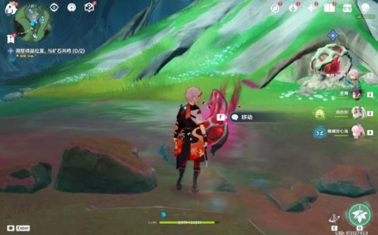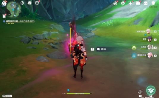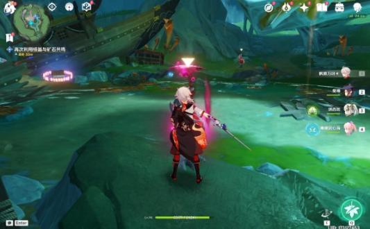 7、玩家要利用棱晶与矿石共鸣,前面的这个就是棱晶,攻击棱晶,会向前释放出一道黑色的能量,我们角色与矿石与棱晶三点一线,对准矿石后攻击棱晶即可使其共鸣;