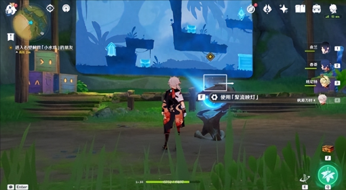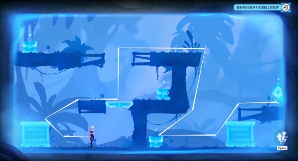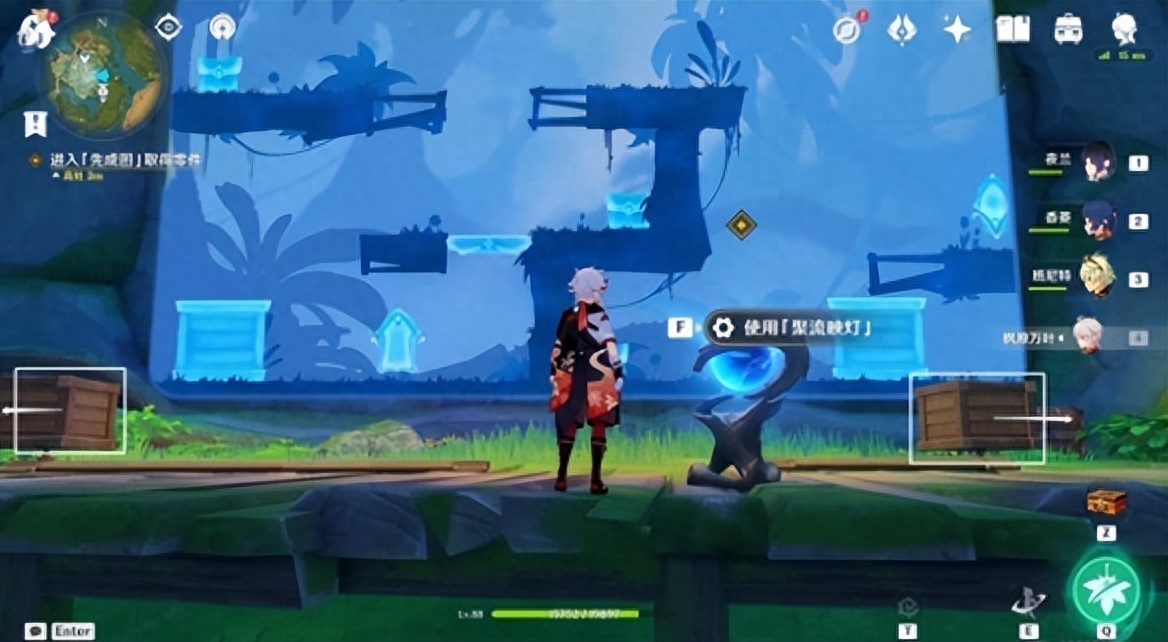 将图中木箱往右推到图中位置后,使用“聚流映灯”,接下来按图中指引路线,开启2个宝箱,在离开“先成图”世界(界面右上角可随时离开)。