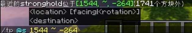 如果我们不想费时费力地寻找要塞,也可以使用指令来直接定位或者传送到要塞。在聊天框中输入/locate stronghold指令后,就会显示最近的要塞坐标;输入/tp @s 坐标 后,就会直接传送到要塞入口。