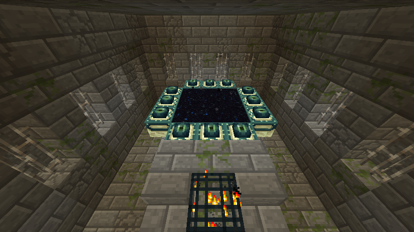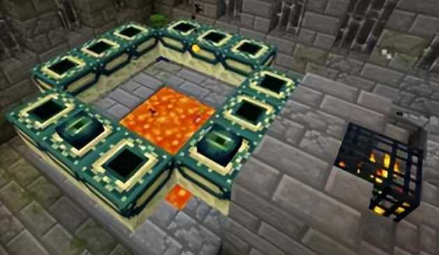 当我们进入了要塞后,就需要寻找传送门房间了。这个房间通常位于要塞的中心位置,并且有一排楼梯通往一个悬挂在熔岩池上方的水平方形结构——这就是未激活的末地传送门。