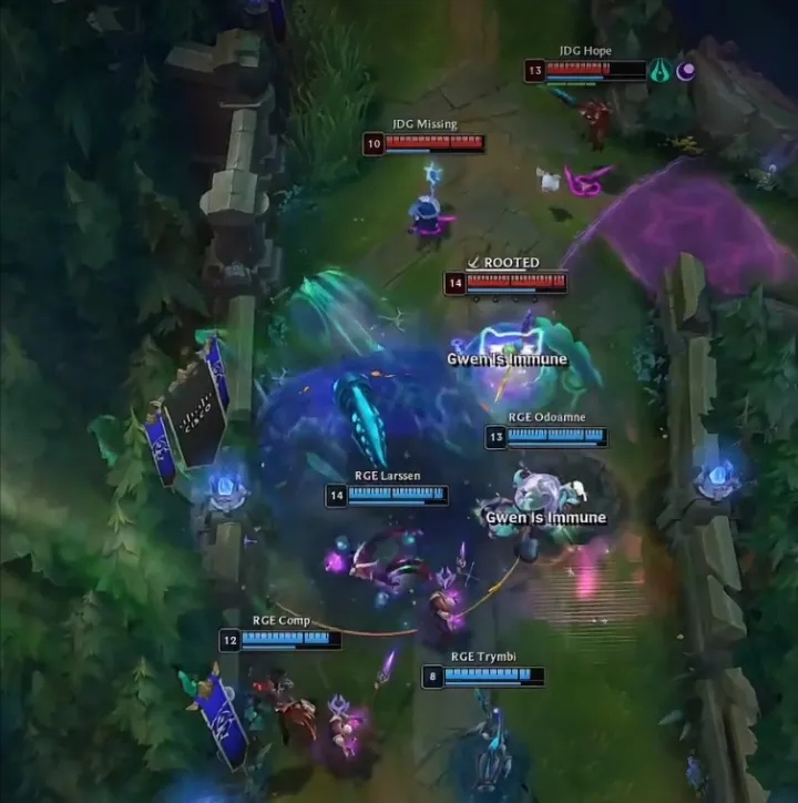 第三局,也是常规bp,你硬实力打不过我,那我就选自己熟悉的,哪怕中下对线上弱一点,因为硬实力强过你,那就稳着打团就行了。上路369奥恩10分钟压40刀,这局rge就处理不掉他了。