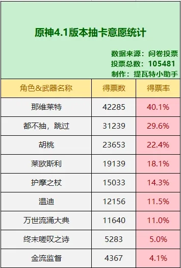 从投票结果可以看到,上半的那维莱特和胡桃,比下半的莱欧斯利和温迪的抽取意愿要高出一半,主要原因有三个: