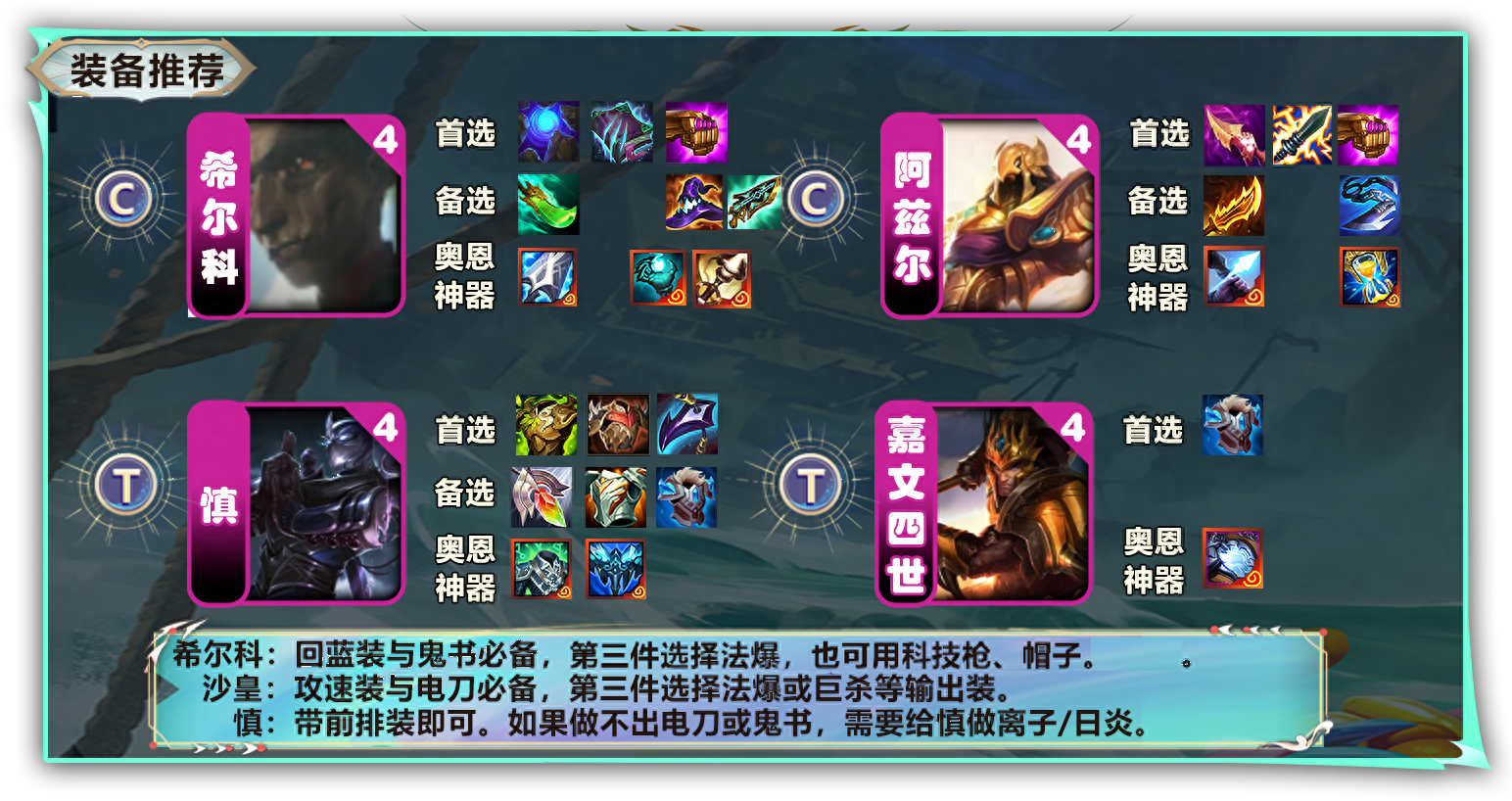 希尔科必备一件回蓝装,优先蓝bf,其次可用青龙刀代替。如果祖安装备是机械手臂搭配青龙刀效果也很好。之后做鬼书,大范围aoe能轻松给很多单位挂上重伤效果,目前环境对阵剑姬,大虫子等阵容都很需要重伤。第三件补出法爆增加输出能力,也可以用科技枪、帽子来增加前排回复能力。