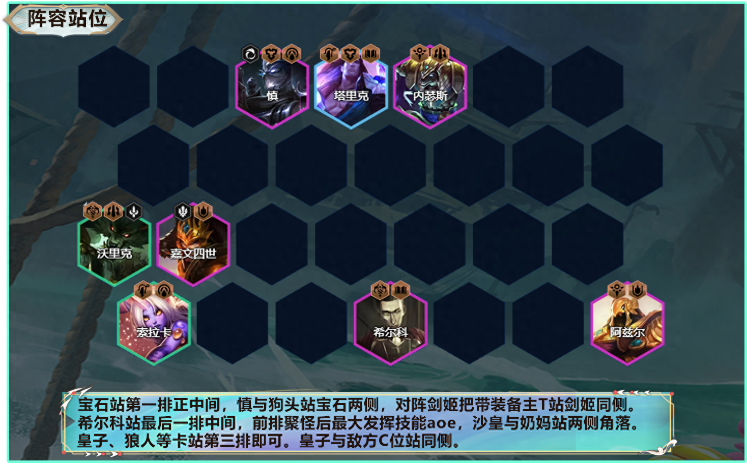 希尔科阵容关键的聚怪,前排让慎和狗头围着宝石站,狼人和皇子可以放第二三排。如果对手有冰甲皇子,可以让其围着奶妈站吃控制。