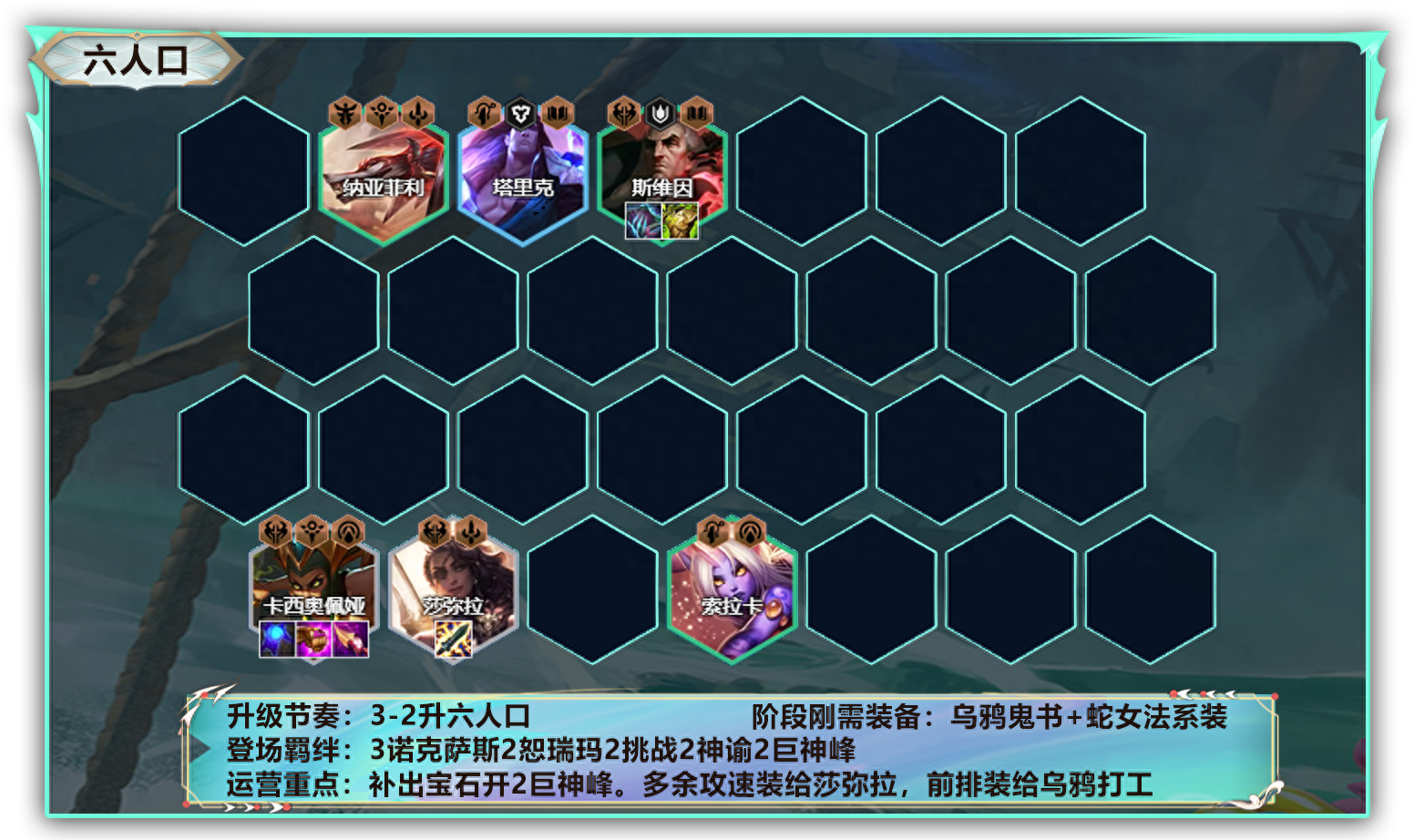 3-2升六人口。最优补出宝石开出2巨神峰。提高乌鸦和恕瑞玛的回血能力。没有可开2司令等羁绊继续散搭。