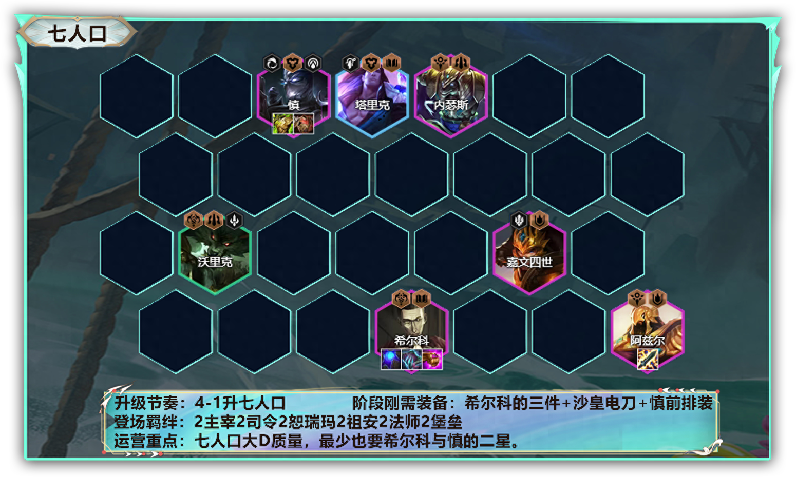 4-1升七人口。大D出阵容全部二星。之后存钱升八人口。最低质量也要二星沙皇+二星希尔科+二星慎再考虑升八人口。若祖安装备为机械手臂,可以用奶妈替换狼人。希尔科做青龙刀则继续用狼人。