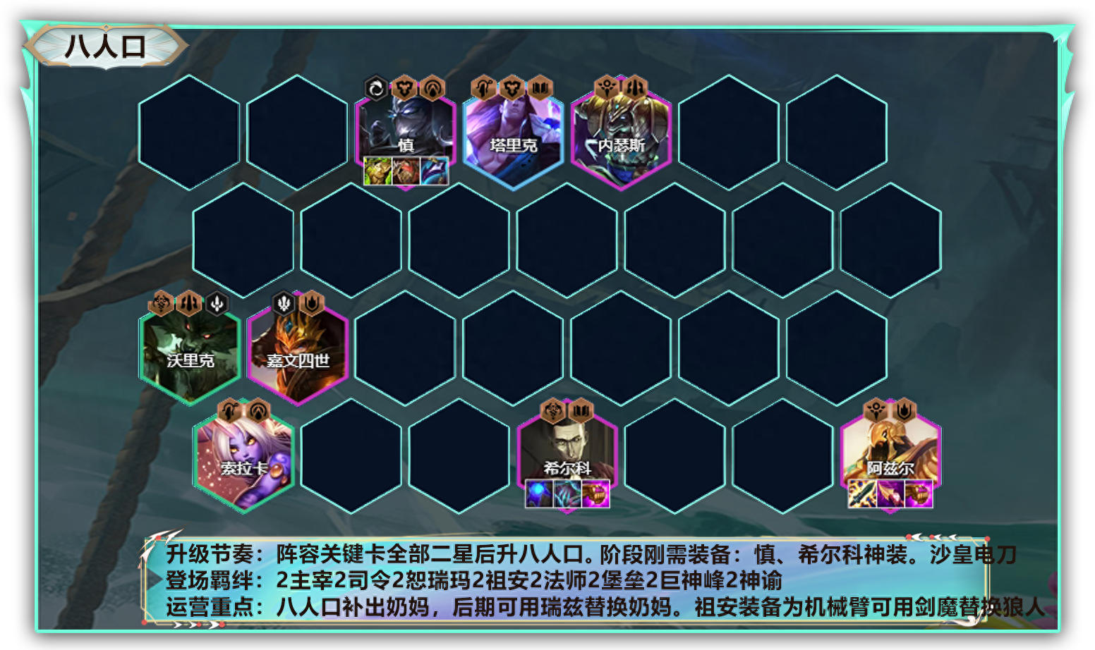 阵容全部二星后升八人口。补出奶妈组成2神谕2巨神峰。后期可用瑞兹替换奶妈;若祖安装备为机械手臂,可用剑魔替换狼人。