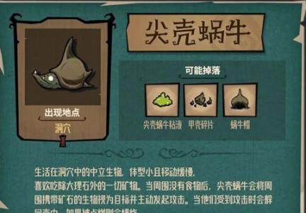 1、饥荒新家园尖壳蜗牛是生活在洞穴中的中立生物,体型小且移动缓慢。