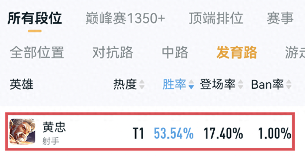 像是鲁班七号,伽罗,黄忠,相较于前几个赛季,胜率以及出场率都有了明显提升,尤其是黄忠,更是以百分之17.4的高出场率,排名胜率第一,俨然已经成为了射手一哥。