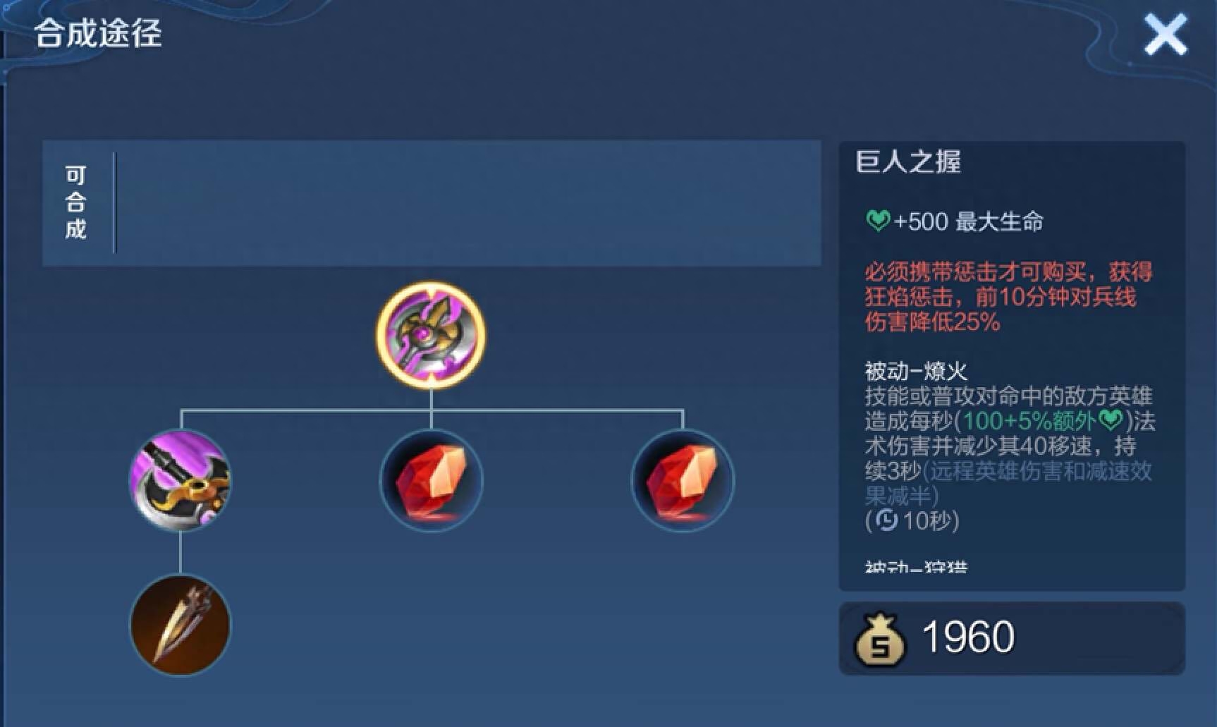 这装备的好处主要还是被动技能,原本这装备的强度其实并不算特别高,但随着其他打野刀的改动以及版本改动,那么巨人之握的属性就逐渐提升起来了。