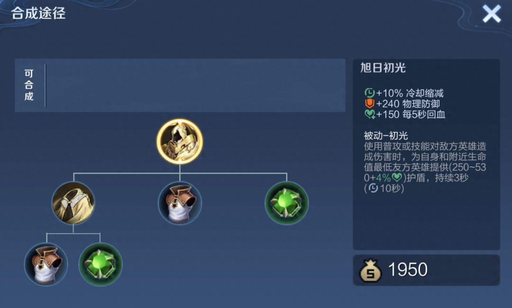 第3件我认为称得上神装的就是旭日初光,这装备应该更适合辅助英雄,虽然坦克也可以出,不过我觉得辅助出这装备更加有价值。