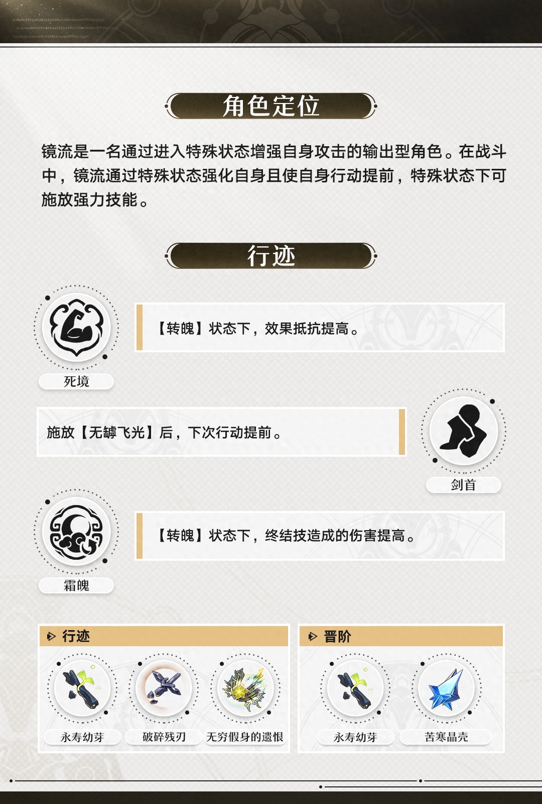 造型设计上没啥好说的,培养着一块提前准备好材料吧,行迹的效果看着还不错,定位就是纯打手主C,通过特殊状态强化自身+拉条,同时特殊状态有衍生的技能效果。