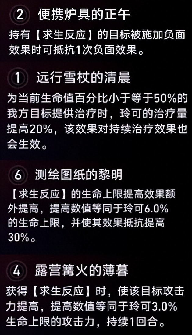 星魂:1,2,4,6都有用,其中2非常关键,能够给带【求生反应】的队友1次抵抗负面的机会,对抗一些boss时就是神技了。