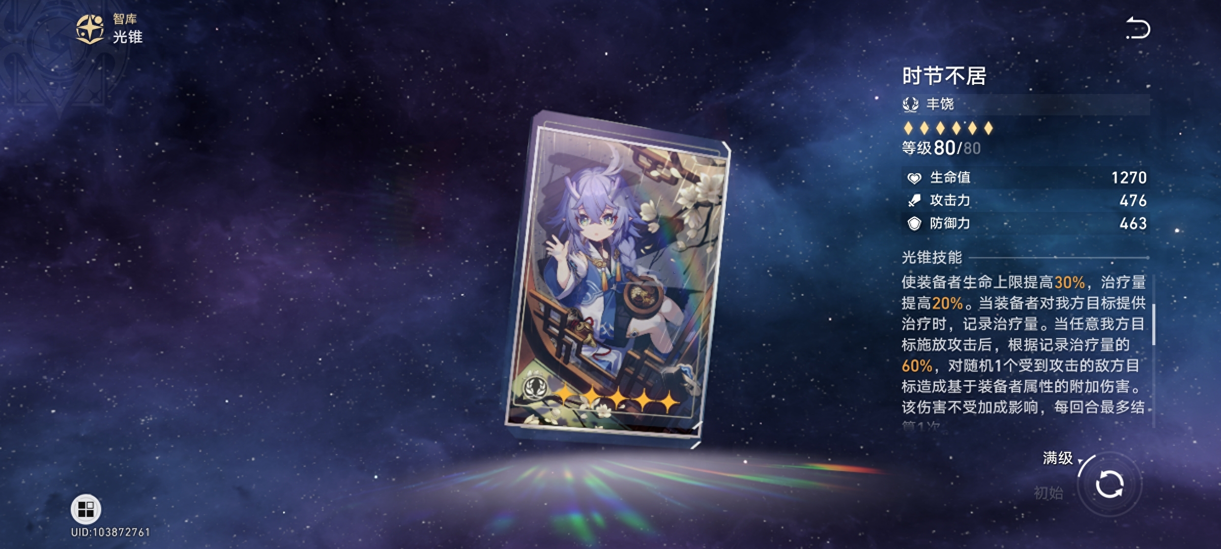 5星时节不居:最优先推荐的,虽然附加伤害可有可无,可是基础生命,以及生命与治疗加成真的太香了,而玲可本身是非常需要生命的,所以光锥有歪到这个又没白露的就她吧。