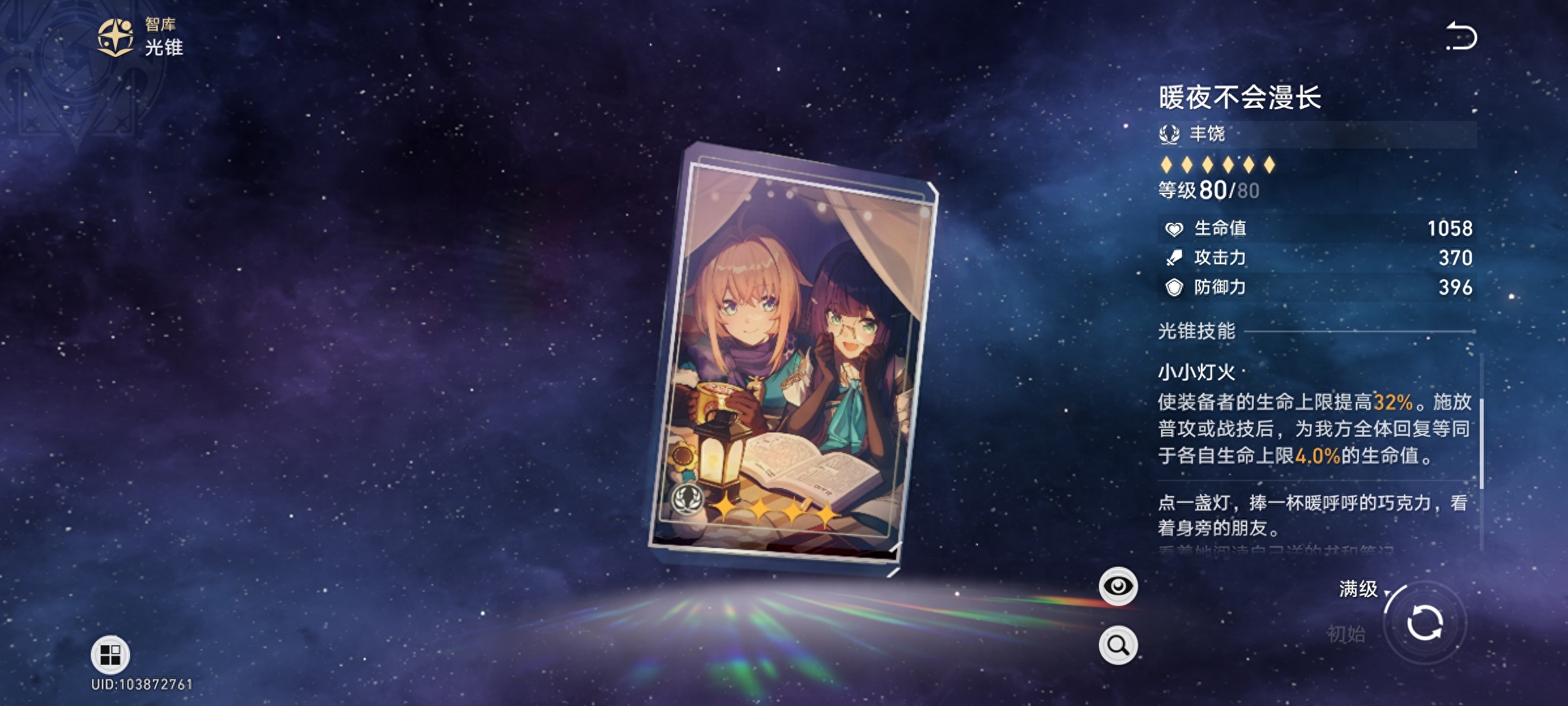 4星暖夜不会漫长:4星方面则最推荐这个,原因同样是因为加了高生命,同时还能多增加一点治疗量,都是玲可最需要的,也比较均衡,适合所有环境。