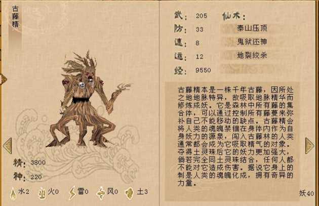 在古藤林这里,景天一行人会遇到这里的BOSS古藤精,此时玩家只要已经练成了“炼狱火海”就可以100%的打出来。而玩家要是没有练成这一招的话,那就不好意思雪见永远得不到这件武器了。