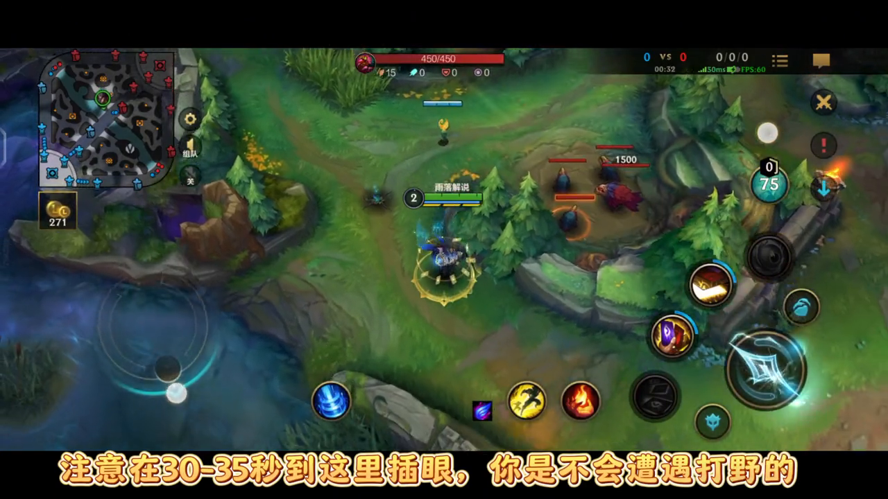 →注意在30-35秒到这里插眼,你是不会遭遇打野的。如果是兵线已经来了再去那就可能会遭遇打野,二级利用红牌威慑对手抢到线权,满状态打野是不会来抓你的。兵线清完关键来了,这个时候必须吃果子因为河蟹要刷了。