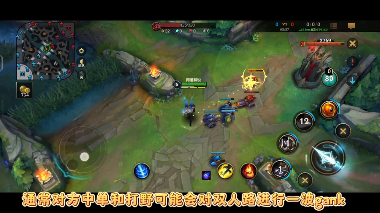 这个时候双方中单即将迎来5级,对方打野也会5级,这就迎来了对线期的第二阶段5级支援。通常对方中单和打野可能会对双人路进行一波gank,而我们就需要利用这个丢人线眼去判断对方中野的动向,主要是配合我方打野的行动。注意这是小龙团前唯一一波团战。