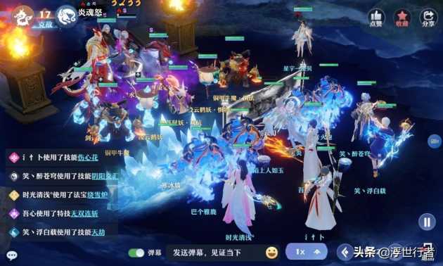 合欢和长生扔水法宝(分别以惧物鹤妖和火妖为中心),奶妈加buff,万毒飞蚁(鬼王狂鬼,速度慢的话可能出不了手),宝宝全部输出(法师没有出手机会)。