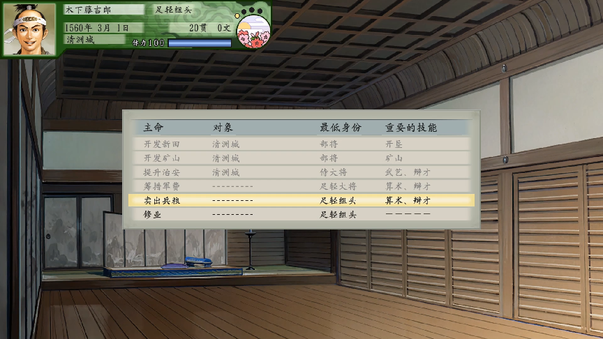 开局后在评定任务中一定要选择“卖出兵粮”的任务,这个任务不仅完成简单,最重要的是能给我们提供启动资金。