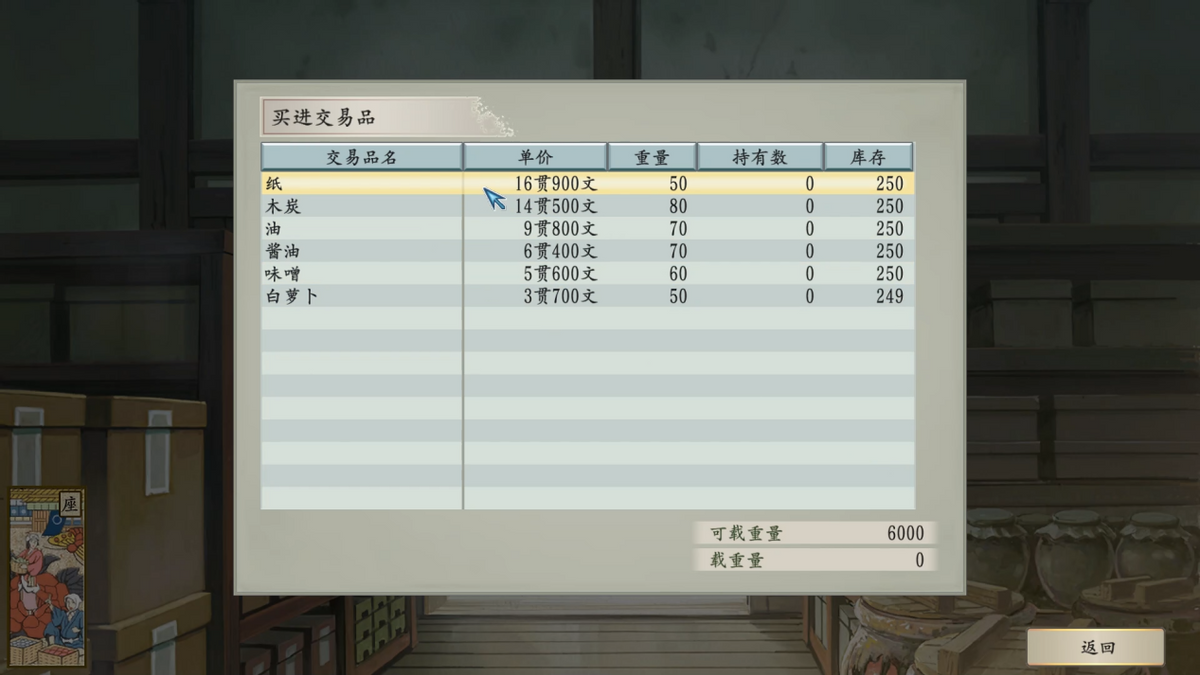直接前往座购买交易品,尽管京之町的牛蒡打折力度很大,但不要被老板给诱惑了,牛蒡的价值非常低,即使全买也赚不了太多钱,趁着库存还充足,把所有资产都拿去买茶。