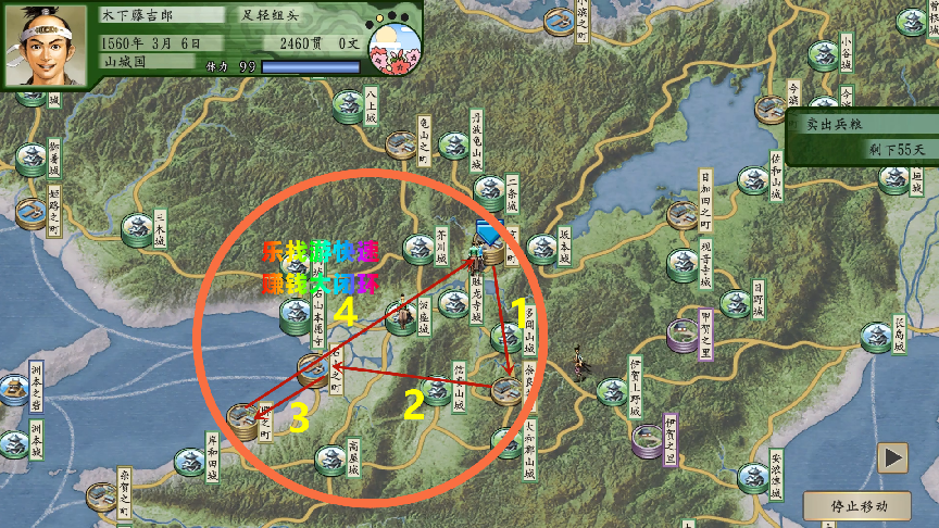 总结一下,京之町(茶)→奈良之町(笔)→石山之町(纸)→界之町(硫磺)→京之町,五个城市四条线路构成了一个完美的初期快速赚钱大闭环,4天时间赚3000贯,还要啥自行车啊!并且及时存档的情况下,除了有盗贼拦路抢劫外几乎毫无风险,时间上也能随时回到主城参加评议,没试过这条线路的小伙伴们赶紧抽空试一试吧。
