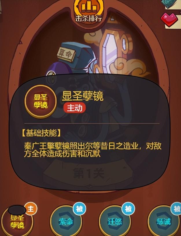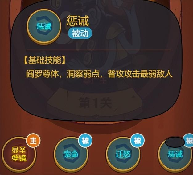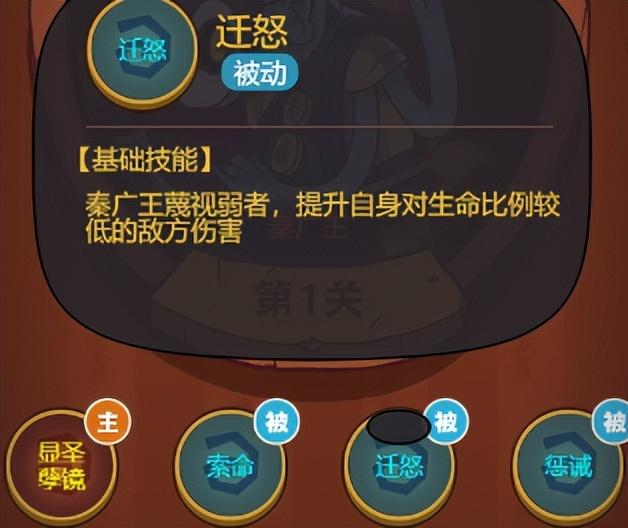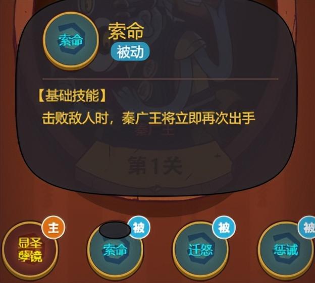 我们在第一层的BOSS秦广王的技能都是什么吧。要想打得过BOSS第一点肯定是要知道他的技能效果是什么。他的大招是对全体造成伤害而且会沉默你的,这里都没有说概率的应该是百分之百沉默的,没有沉默免疫的话,第二个技能相当于是一个连击的技能的,他击败你一个咸将的话就会在次攻击的,如果攻击有击败他还会继续攻击直到他的攻击没有击败目标为止,这个技能还是非常的强的直接收菜。然后是三技能也算比较强的他对比自己生命值低的武将造成的时候更高的和他的最后一个技能差不多是攻击最弱的一个敌人的。后面的三个被动技能就好像是连贯的一样的,会优先攻击血最低而且最弱的武将的,然后击败之后在继续攻击,开局都可能会收菜的