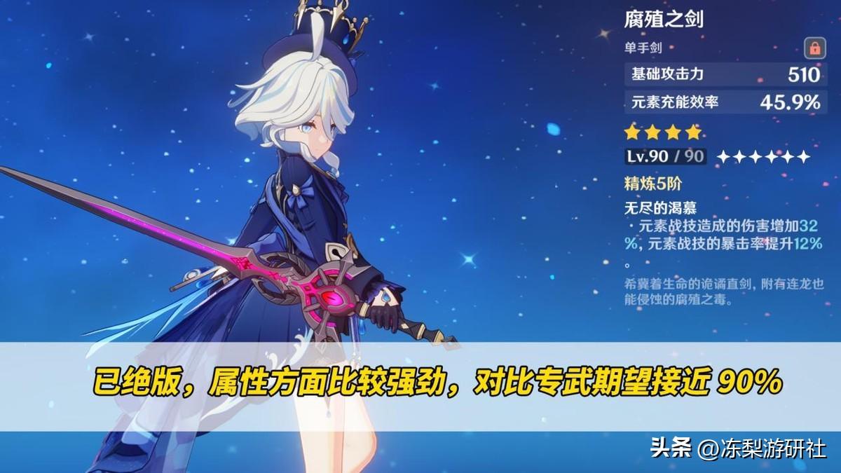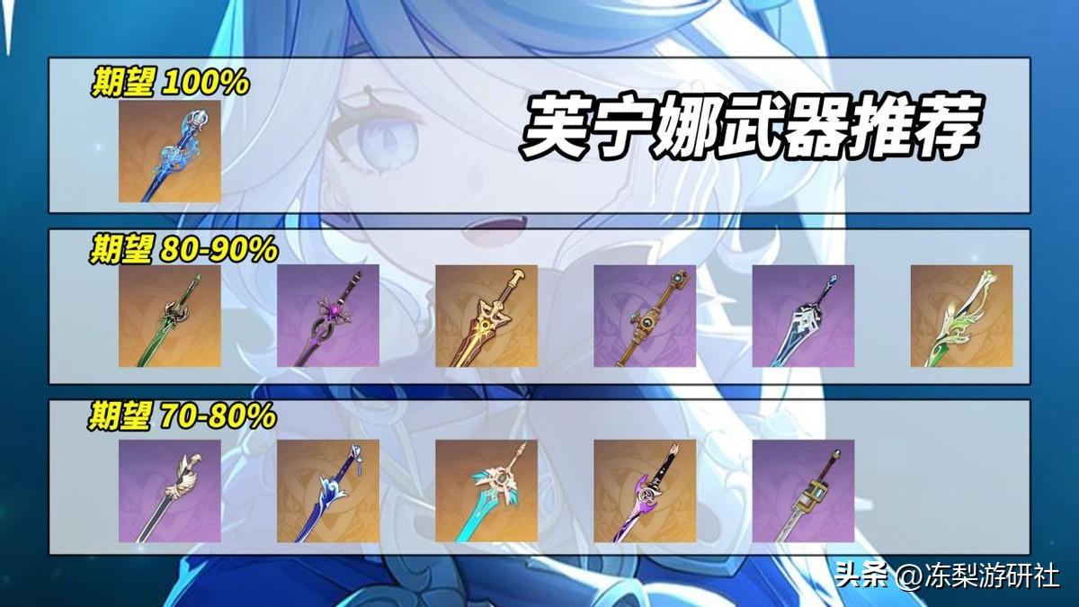 【第二档,80-90%期望】磐岩结绿>腐殖之剑>显圣之钥>灰河渡手>狼牙>裁叶萃光。友情提示,其中不少暴击率武器虽有较高的期望,实际在调配词条时,非常容易满暴溢出。冻梨带个绿剑直接110%多暴击率了,头大。可以考虑其中提及的两把充能+低暴击武器,在遗器搭配方面可以降低对充能词条的要求。