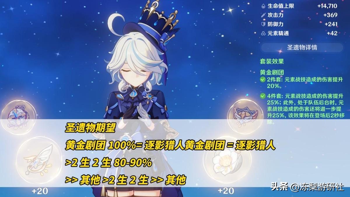 逐影猎人有个问题,角色处于后台不会叠层,基本只适合6命站场的芙芙玩家。2生2生则是看似摆烂,实则差距在可接受范围的选择,预估期望是剧团套的80-90%之间,若有优质圣遗物完全可以追平这个差距。