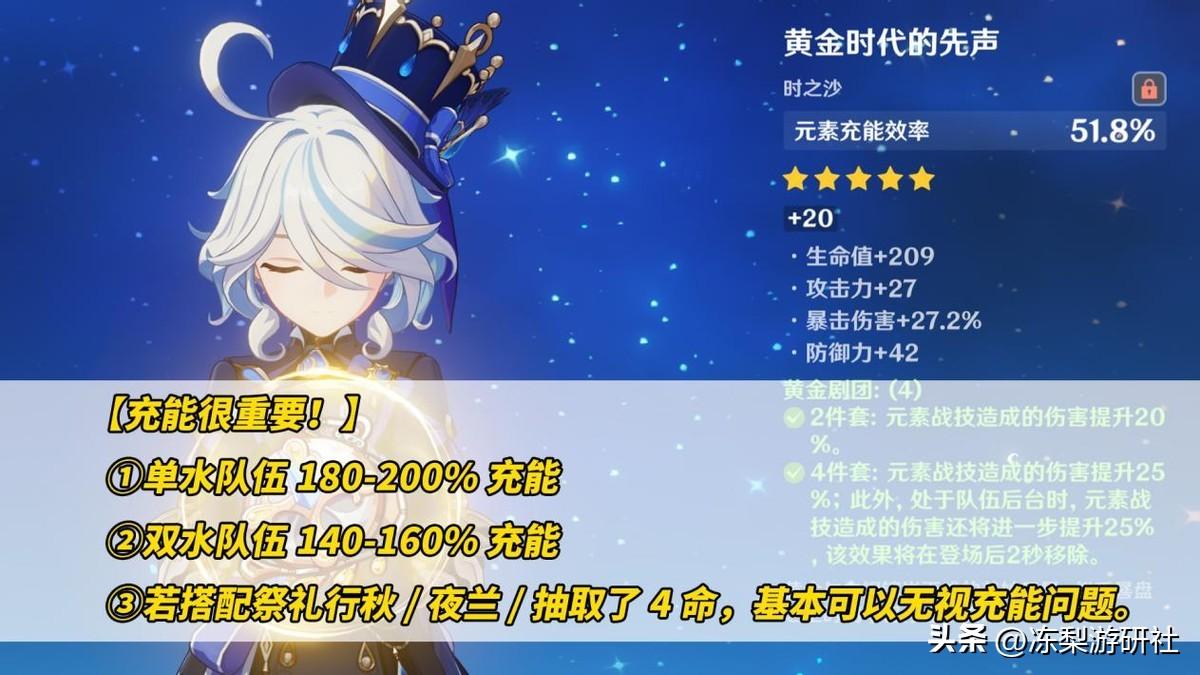 【芙宁娜充能问题必须注意!】建议,单水队伍180-200%充能,双水队伍140-160%充能;若搭配祭礼行秋/夜兰/抽取了4命,基本可以无视充能问题。