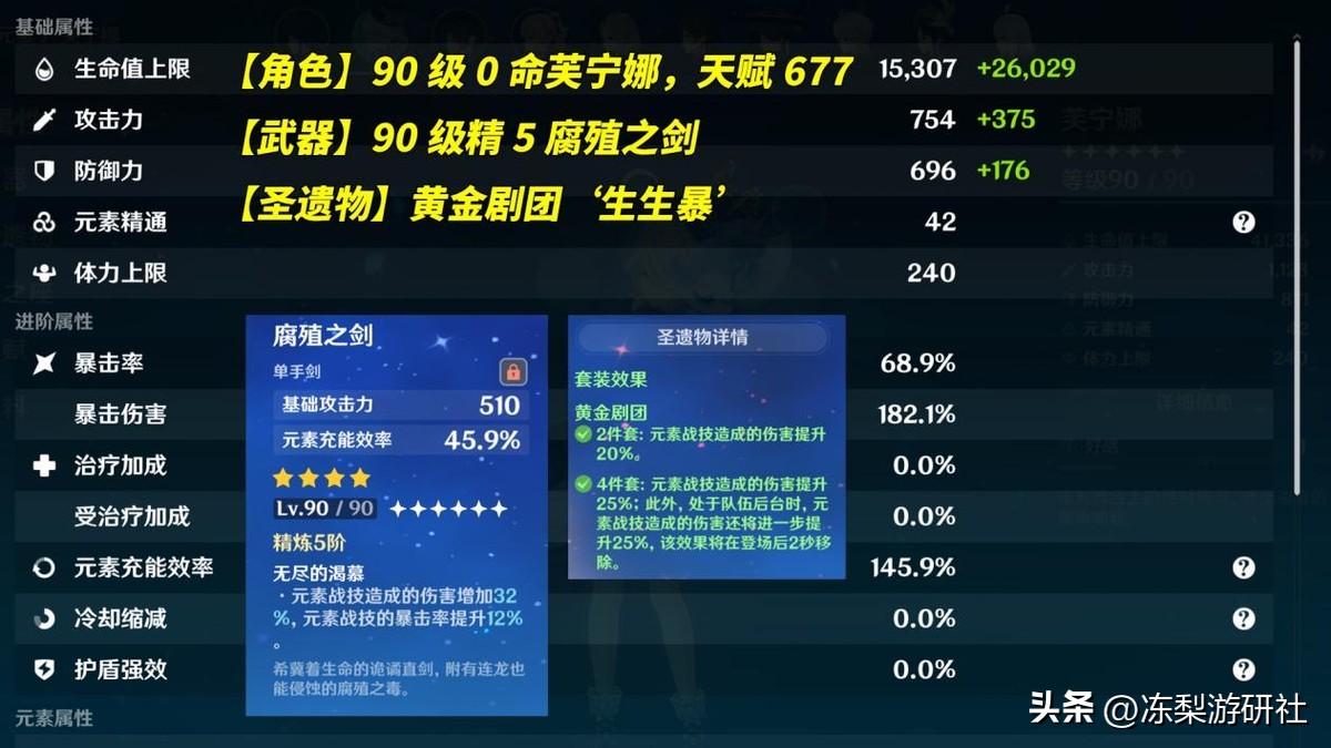 配置方面,90级0命芙宁娜,武器90级精5腐殖之剑(伤害期望约为‘静水流涌之辉’85%-90%的样子),天赋受制于周本刚开目前是677,圣遗物黄金剧团‘生生暴’。