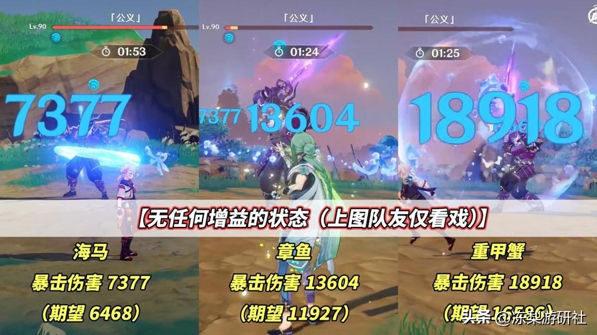 【无任何增益的状态】海马暴击伤害7377(期望6468)、章鱼暴击伤害13604(期望11927)、重甲蟹暴击伤害18918(期望16586)。芙宁娜大世界最常见的状态,元素爆发也不开,就看召唤物自己打怪。