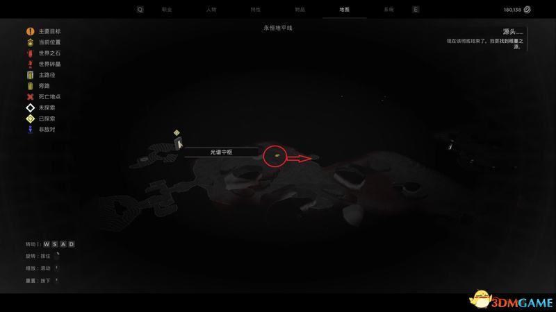 如图从光谱中枢来到永恒地平线红圈位置,前往箭头所示地图边缘。