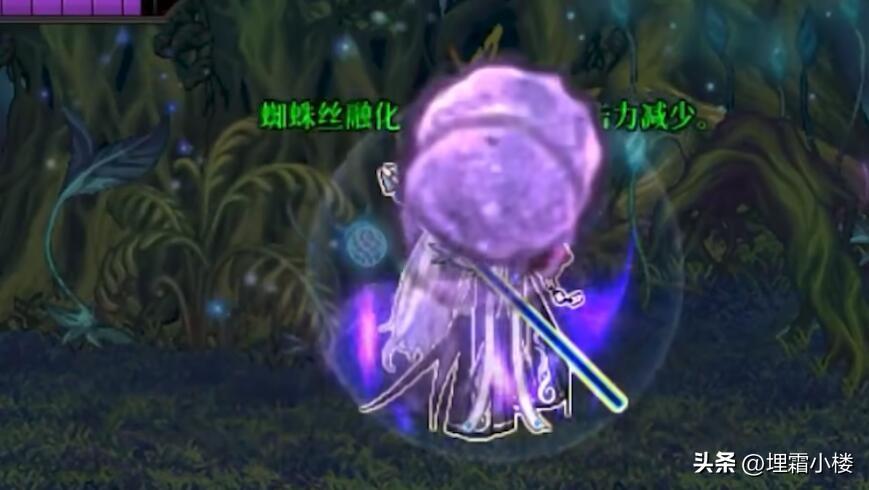 右侧房间场地中会出现紫色蜘蛛丝,若玩家触碰到蜘蛛丝则会受到大量伤害,需要玩家用普通攻击清理掉。