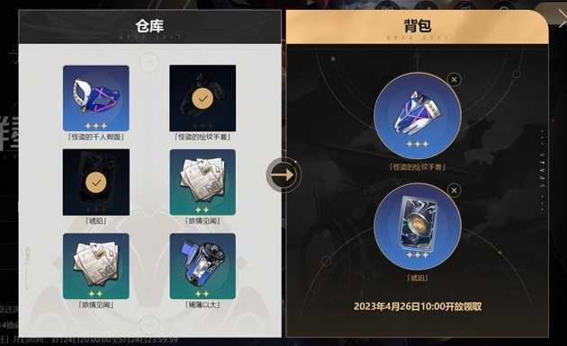 在背包页面可以选择保留两项物品,等到4月26日可领取。