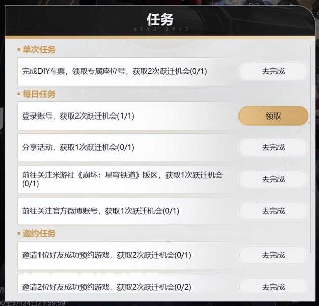 然后在左下角可以查看任务并领取跃迁的机会。