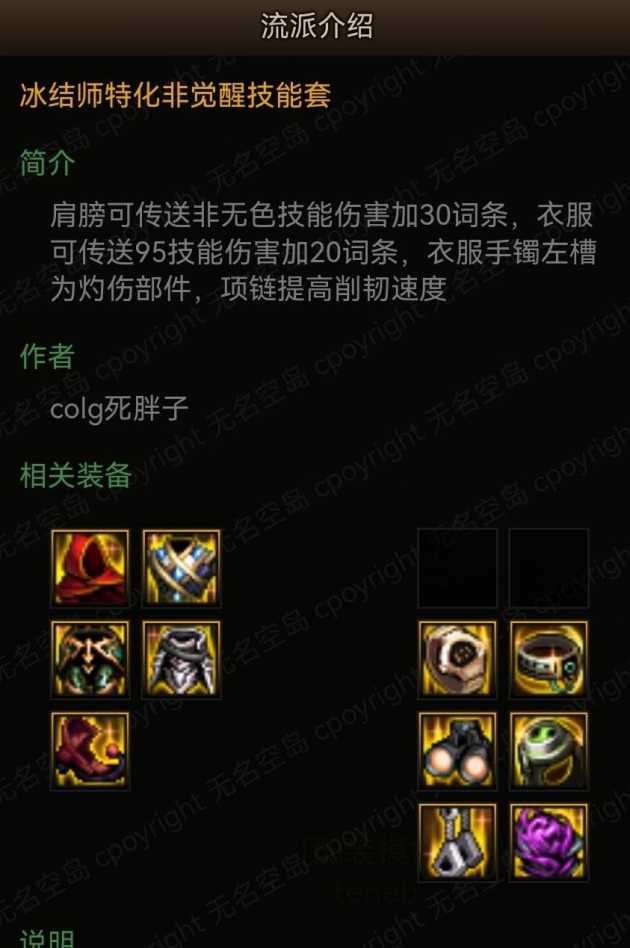 一整套搭配下来,冰洁的非无色小技能,冰剑冰弓破冰有腰带14,耳环20,肩膀30的增伤,主力无色绽放有肩膀20,腰带14,耳环20的增伤,冰锤绽放也能吃到腰带耳环,同时附带霸体高速和大量cdr,灼伤散件效果也得到保证,配合护石9保绽放加上cp武器,得到一个超高伤小技能和绽放冰锤无限循环的效果,高阶无色就使用95和碎冰破就可以了,其他的放在上排做功能性技能用。
