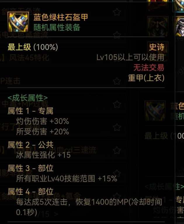 衣服选蓝色绿柱石盔甲,30灼伤20自身被击伤害,传送属性选择95技能伤害+20词条