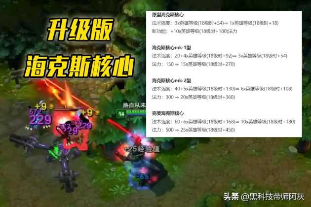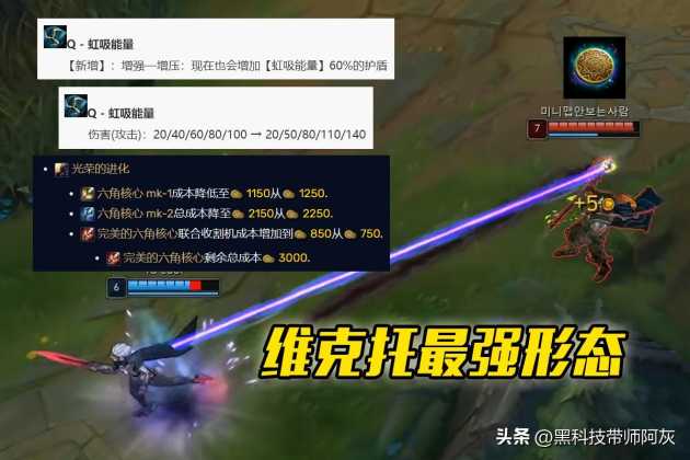 直到4.5版本,维克托迎来了第一次光荣进化,普通Q技能新增二段强化平A,大招沉默降级为打断,重点是海克斯核心被史诗级加强,只需3000金币就可以强化所有技能(每一级1000,大招附赠),强化Q还是加移速,强化W变成了聚怪,强化E改为二段伤害,强化大招可以增加雷云速度。属性方面也得到了大幅提升,最开始完美海克斯核心可以提供60+6*英雄等级的法强,前期做出来就有上百法强和500法力值,要知道维克托可是一个后期英雄,前期属性就这么离谱发育谁能挡得住?经过下图一番削弱后才稍微平衡了一些。