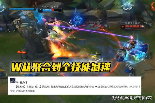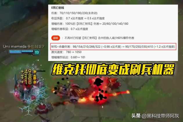 除了海克斯核心强大的属性之外,这代维克托还有一个OP之处,那就是强化E中了第一段基本必吃第二段且伤害巨高,后期脆皮吃一个光线半血就没了,导致其他技能没什么存在感,于是设计师在6.9版本中对维克托的技能强度进行了调整,ER整体伤害提升,但想打满变得更难了,尤其是E技能二段延迟时间多了近一倍,必须得结合W技能使用才能发挥最佳效果,而这便是设计师的目的,想打更多的伤害?那就操作起来吧!