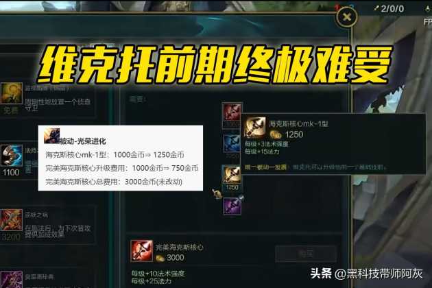 为了让维克托前期不这么舒服,设计师给一级海克斯核心涨了250金币,大家可别小看这次削弱,个人觉得是最狠的一次,除非能捡到人头,不然第一次回家很难攒够1250金币,这个时候就很尴尬了,买其他装备拖节奏,不买装备上线又要被暴打亏兵,简直是终极难受,以至于维克托在路人局中地位暴跌。