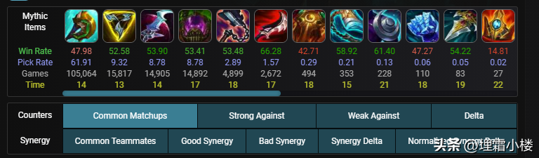 10万场次48%胜率,而其他装备只有1万场,但是胜率都稳定在53%,中和之后再参考国服人马的50%胜率,不难发现,神分的胜率会偏低,被其他的神话出装抬高了胜率。