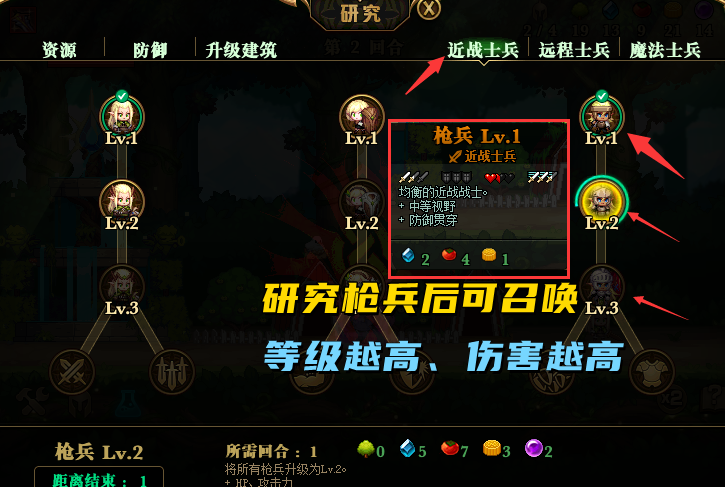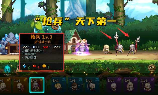 【士兵】:包括了剑士、枪兵、盾兵、弓箭手、魔法师等,这里只推荐“枪兵”,不仅伤害高,而且防御也很高,基本可以全程使用,除了1级召唤2个基础剑士外,后面一直召唤枪兵即可。