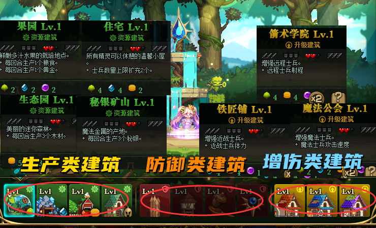 【建筑】:分为两大类,一类是“生态园、果园、矿山”等,这部分建筑可以产出资源,资源可以用来召唤士兵、或者升级士兵,在前期比较重要;