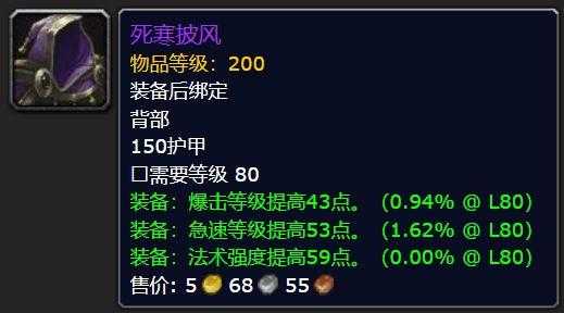 死寒披风是一条裁缝制造的200装等装备绑定披风,我们从下图可以看到它是没有主属性的,而全部的属性只有爆击等级、急速等级和法术强度。正因如此,导致它的输出价值极高。