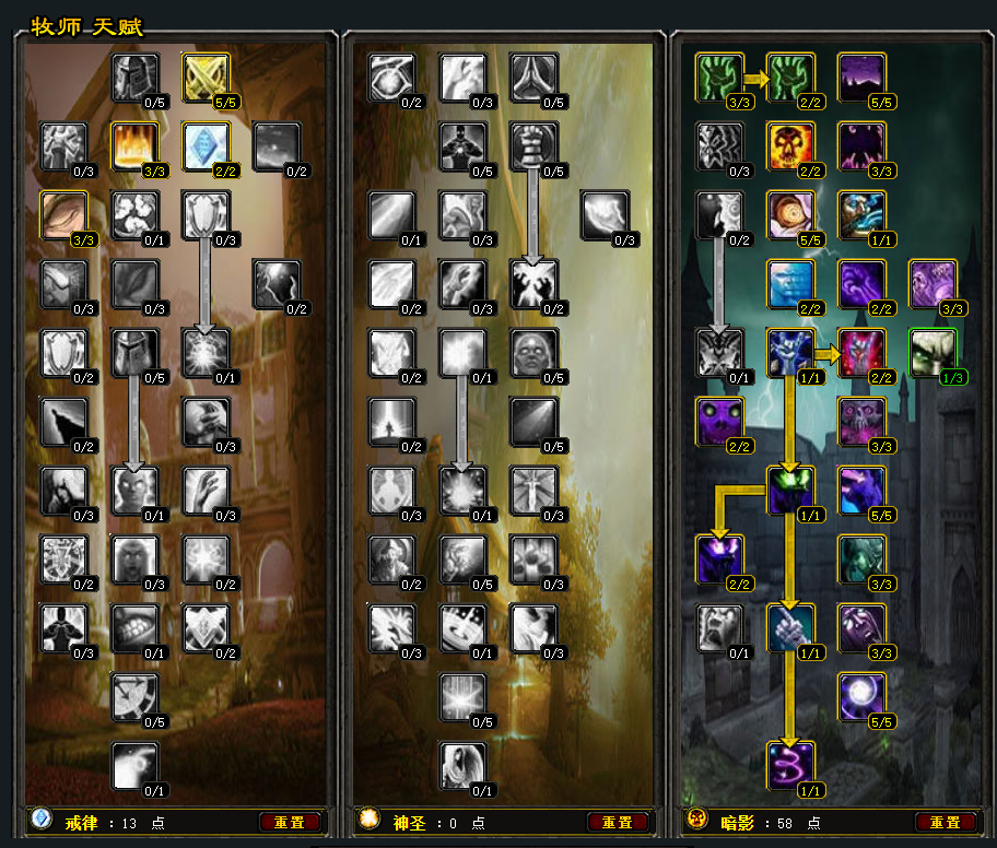 首先说一下天赋,80级暗牧推荐13-0-58的点法。戒律这边点出冥想,可以确保续航,暗影系点56点已经可以覆盖所有增伤天赋。这个天赋新手朋友可以直接抄作业,没毛病。