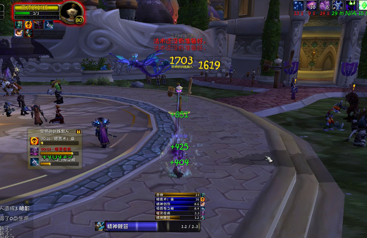 上面就是暗牧的起手顺序,后续保持吸血鬼之触和噬灵疫病没了就补,心灵震爆好了就用,其余时间就打精神鞭笞即可。80级的暗牧,木桩战斗不需要打灭,因为灭的伤害一般且CD较长,在走位的时候可以偶尔穿插一个即可,回血大招与回蓝大招团队情况酌情使用。