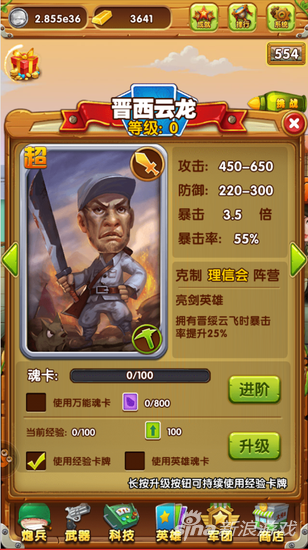 4、 合成卡牌。玩家们可能有所不知,《爆点炮炮兵》里的英雄卡牌,除了可以用来参加卡牌战斗和天梯决斗之外,还有一项强大的功能,那就是给英雄和炮炮兵增加增益BUFF!例如同时拥有晋西云龙配合晋绥云飞时,能够提升25%的炮炮兵暴击率;麻匪和一剪梅同时拥有后,能够提升10%关卡金币掉落速度!多集卡牌多加BUFF,卡牌越多,获益越多!