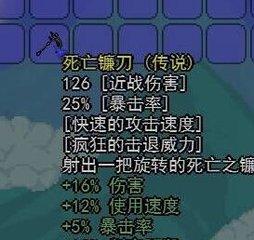 泰拉瑞亚死神镰刀的性能介绍 图文详解。死神镰刀是一把掉落于日食生成的死亡收割者的近战武器。跟大多数与它同级的近战武器一样,它能够远程攻击。。但是还有一部分玩家不是很了解死神镰刀,所以小编就给大家介绍一下。