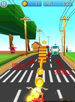 卡车分两种,一种是红色的卡车,车前带着楼梯,玩家可以从这梯子直接跑上卡车。另一种是蓝色的卡车,前面没有梯子,撞上了游戏就失败了,玩家看到前方有蓝色的卡车一定要更换路线躲开它。